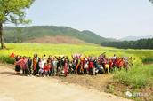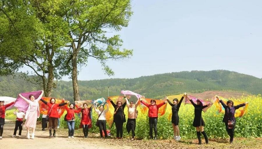 翻过一个小山头,跃入眼中的是一大片的金灿灿的油菜花地,阳光下的油菜花格外奔放。南风吹过,涌起一股又一股金色的波浪,在阳光的照耀下闪过来一波又一波亮光。油菜花田里,清新、自由、沁人心脾的香味无言以表。在灿烂的油菜花田中,大家欢喜雀跃的一个个情不自禁的掏出手机,要留住这眼前的美景,有的还用上了自拍神器“自拍杆”,大家三五成群的摆着不同姿势要把这美景收录手机中,有的则拿出预备好的艳丽纱巾,随风飘逸的拍照,有人提议姊妹们舞动纱巾跳起来拍,看着这些可爱的姊妹们,不分年龄的乐呵着,真是体验到“在主爱中真诚的心,到处相爱相亲”。