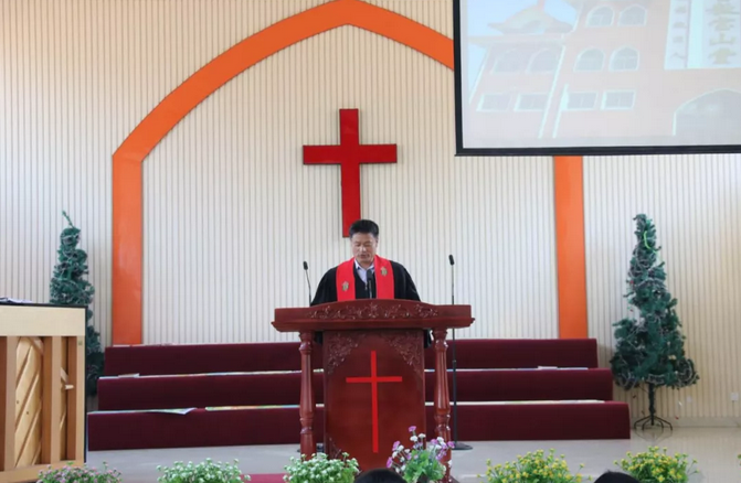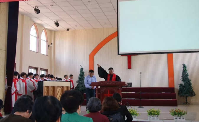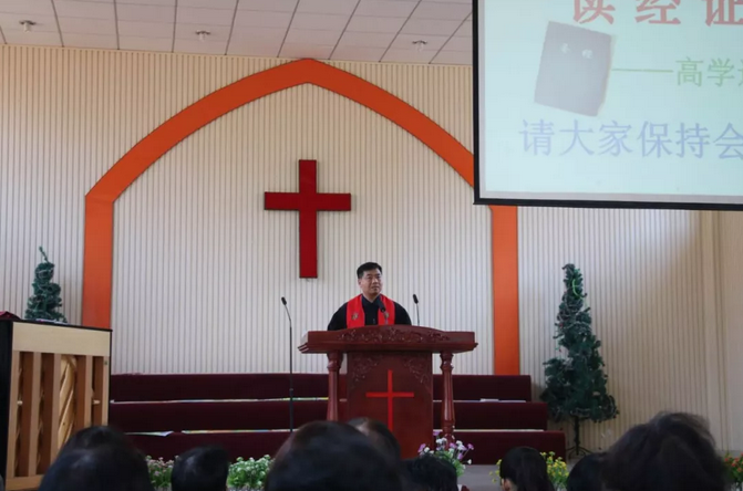 本次典礼由临沂高新区基督教两会副主任、副会长(兼秘书长)张德福同工主持,临沂高新区基督教两会焦洪艳同工读经,临沂高新区基督教三自爱国会主任高学进长老带领会前灵修。高长老藉出埃及记13章1—16节的经文,从“感恩奉献、代代相传、牢记神恩”三个方面与大家共同分享《纪念的属灵意义》。灵修分享结束后,大家共同起立同唱赞美诗125首《教会我所爱歌》,然后由高长老为宝山堂献堂十周年感恩庆典作祝福祷告。