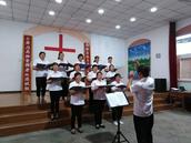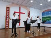 大概在14:20左右,来到了渭河南岸、秦岭脚下的凤鸣教会。进了主堂,里面已坐了不少早到者。主台左侧旁一位姊妹正在教唱赞美诗歌,待笔者刚刚坐下,也就到了教会开始他们聚会前的、14:30雷打不动的崇拜赞美时间。只见三位姊妹走上主台,在电子琴音乐伴奏下,一曲接一曲的献唱了多首赞美诗歌。台下的会众也齐刷刷站立起来,回应着合唱起来。