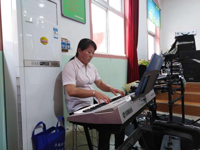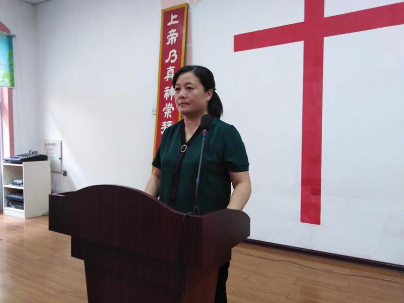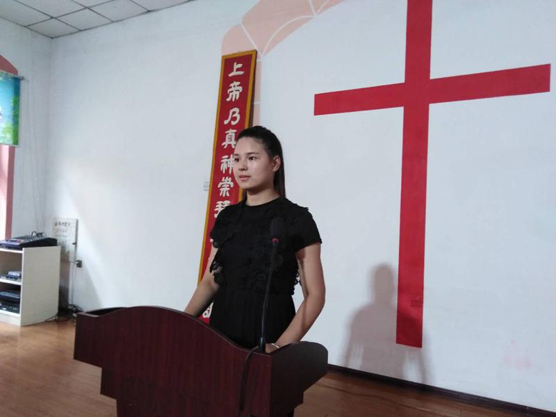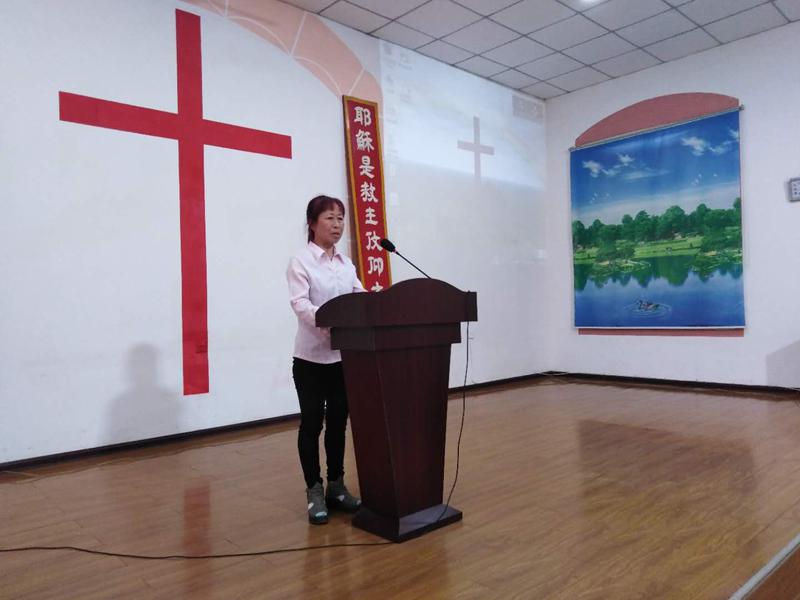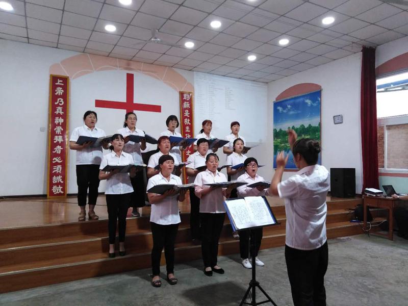 15:00,在会众齐祷和主持人闫姊妹代祷后开始了。首先是诗班登台献唱,只见十二位姊妹身着白色短袖统一服装,登上主台依阶站成三排。她们在电子琴音乐伴奏下,满怀对主的敬爱及夏粮丰收后的喜乐,向主献唱了《耶稣掌权》、《立定心志》两首赞美诗歌。