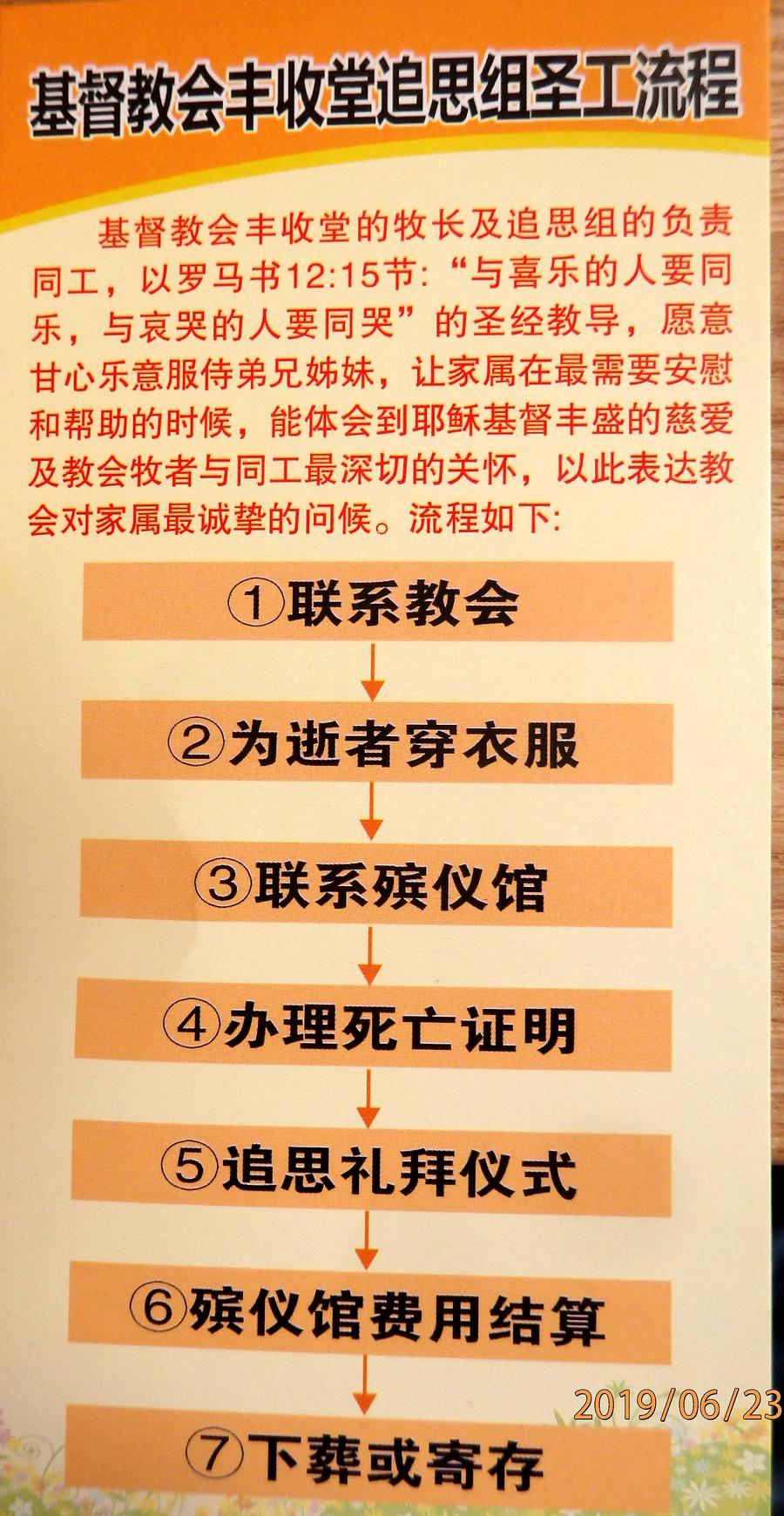 追思组姊妹告诉我:丰收堂追思的“一条龙”服务按照教会规定的《追思组圣工流程》操作,大约有八项免费服务:免费为逝者提供归天服、褥单、被单等;免费提供所需的车辆;免费为逝者穿衣服;免费联系殡仪馆;免费帮助跑开死亡证明、联系墓地等;免费帮助殡仪馆费用结算;免费帮助下葬或骨灰寄存的;免费提供追思礼拜等。对于鳏寡孤独的特困肢体,教会还会额外提供一定的资金补助。