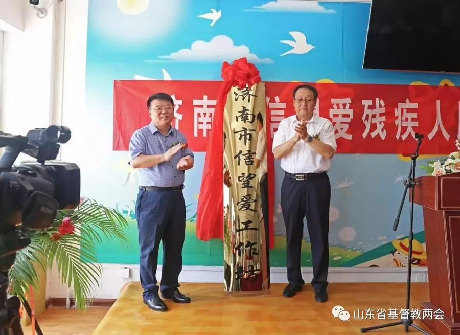 活动由世纪金榜集团副总经理王强主持,高明牧师与葛忠明理事长共同为信望爱残疾人服务中心揭牌,张泉董事长与李赋真牧师共同为济南市信望爱工作坊揭牌。