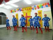 上午9:00,主日礼拜聚会在会众祈祷及主持人伍晓宇姊妹代祷后开始了。首先是他们诗班登台献唱,只见11位弟兄姊妹身着统一天蓝色体恤,非常阳光的站在主台十字架前。他们手捧歌夹,没有指挥,没有弹琴的。在杨长老亲自播放音响的伴奏下,他们满怀对主的爱,仍然完美、豪情的献唱了《天家最美 主最爱你》、《十字架是我的荣耀》两首赞美诗歌。
