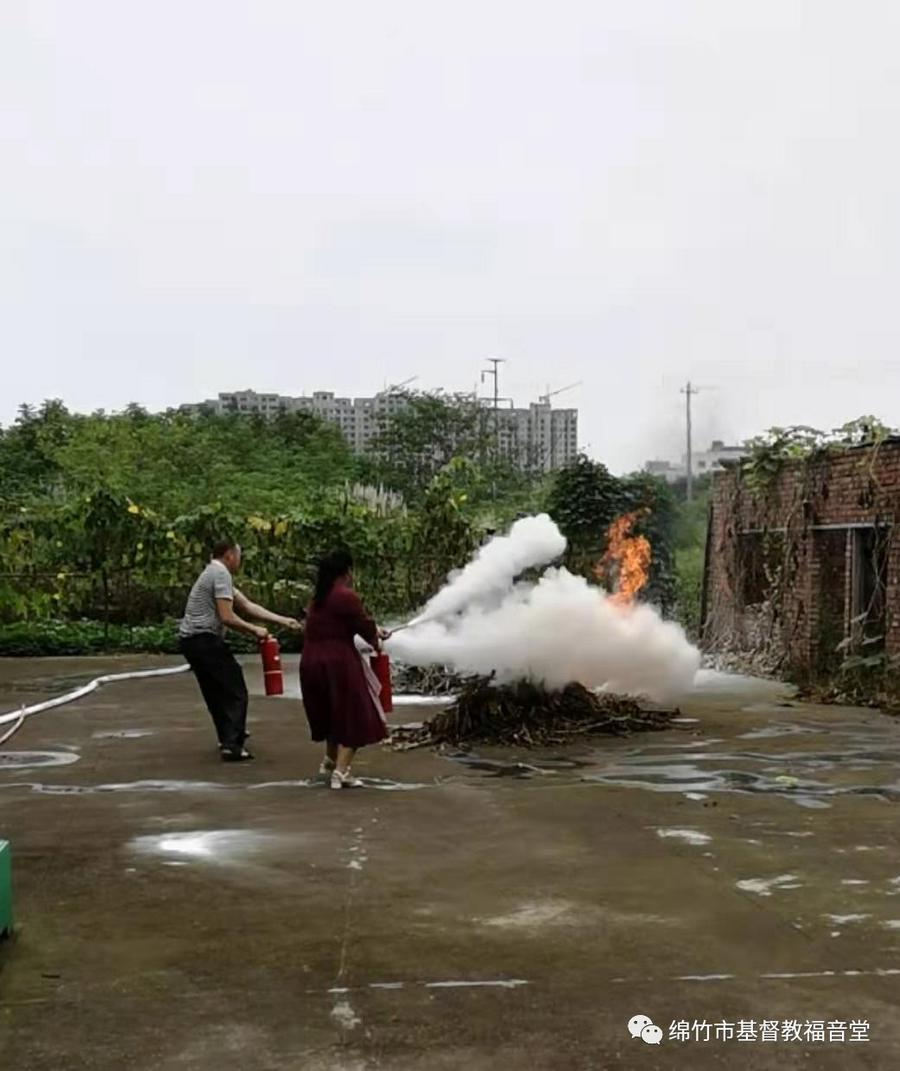 与会人员还一起进行了消防演练。在消防副组长肖义勋的带领下,消防员江绪洪、杨道发、夏荣富、陈必荣等在福音堂篮球场进行了灭火器和消防栓水阀灭火演练,参会代表一起观摩学习使用灭火器。
