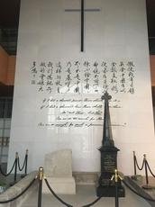 文字下方的地上,摆放着戴德生与原配夫人玛利亚的墓碑,左边的一块已经损坏得只剩部分。脚下负一楼是他们的棺木所在地,碑上只刻着“他虽然死了,因信仍旧说话”。