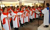 西山堂的圣诗班以高亢激昂的歌声献诗赞美上帝、祝福新中国七十周年诞辰。会众以热烈的掌声将荣耀归神。
