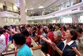 赞美会在吴兵牧师带领教会的牧师、教士和全体信徒起立举手,为国家祈祷中圆满结束。