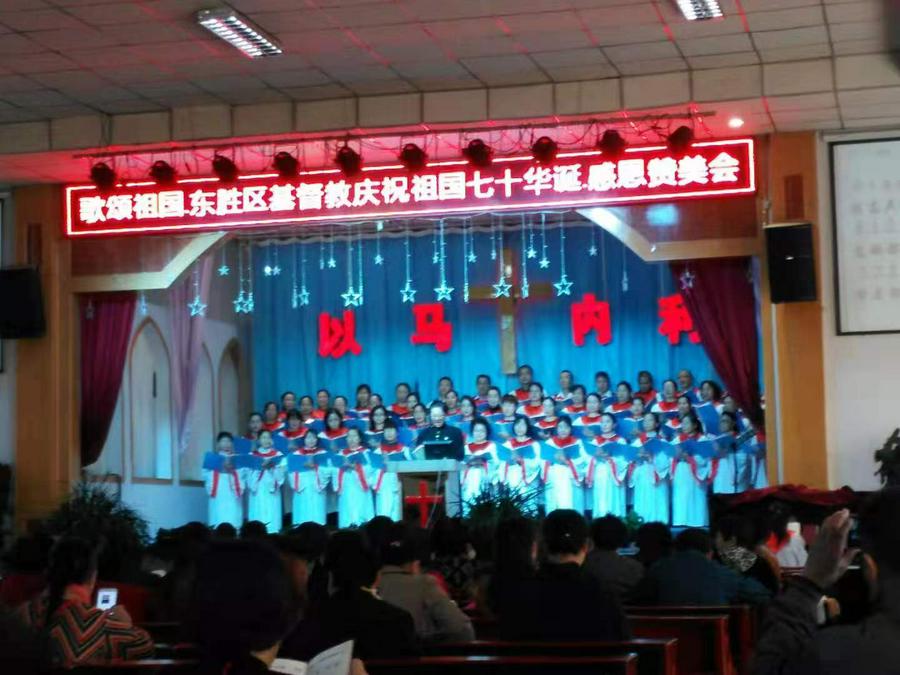 为了庆祝中华人民共和国成立70周年,9月21日,内蒙古鄂尔多斯市东胜区基督教会举办了一场别开生面的感恩赞美会。早上07时30分,教会的牧长同工和广大信徒一道,站在国旗下面;8时许,举行了升国旗仪式。