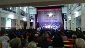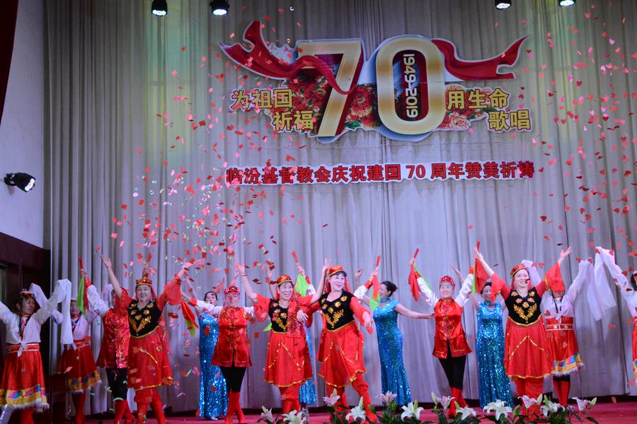 接着教会全职同工登台演唱了《祝祷明天》,随后由七个牧区组成的方阵,弟兄姊妹身着统一服装,共同起立分别演唱了《今天是你的生日》《友谊地久天长》《团结就是力量》《天耀中华》《爱我中华》《在希望的田野上》《我的中国心》《翻身农奴把歌唱》;此起彼伏的歌声,汇成欢乐的海洋,每一张笑脸都写满了幸福;教会舞蹈组的姊妹身着节日盛装,以曼妙的舞姿,给人以美的享受;最引人瞩目的是旗袍走秀和剪纸作品完美结合,在舞台上翩翩起舞,完美展现了中华民族传统文化的博大进深,当“我爱中华”巨幅剪纸作品呈现舞台时,博得全阵阵热烈掌声;随后精神矍铄七十八岁的老弟兄张宝贵,饱含激情现场朗诵了自己创作的诗歌《祖国,我爱你!》;盲人弟兄朱荣光独唱《我家在中国》,声音浑厚,令人陶醉。舞蹈《祈愿颂中华》《爱我中华》,表达信徒心声;由本堂精心编创演出圣剧《讲述我们的故事》,再现临汾教会第一位牧师席胜魔的感人故事,使演出达到了高潮,许多人不禁热泪盈眶。最后杨牧师带领献上祝福祷告,崇拜圆满结束。