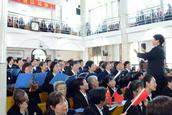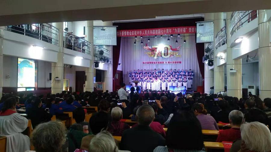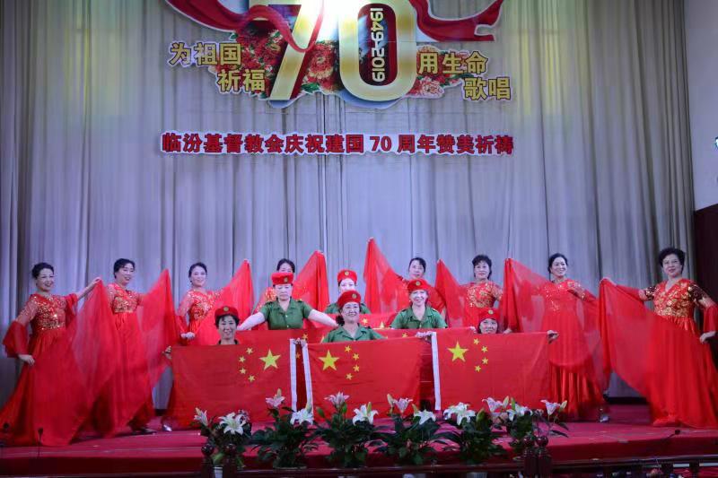 首先举行了隆重的升国旗仪式,伴着圣乐队奏响雄壮的国歌声中,五星红旗在众信徒的注目礼中在教会院内冉冉升起。上午九点三十分,赞美祈祷崇拜由市基协会长杨森林牧师主持,圣乐队登台奏响国歌,全体肃立一起同唱。区基协副会长杨国华长老献上代祷,市三自副秘书长谢春兰宣读了提摩太前书2:1--7,但6;10的经文,诗班身穿圣服献唱了《神工妙笔歌》《我的祖国》《保卫黄河》《我爱你中国》,耳熟能详的乐曲响彻教堂内外,雄壮豪迈的旋律引起了广大信徒的共鸣,许多人手摇国旗,像一波又一波翻卷的红色浪潮,情不自禁跟着一起吟唱,爱国情怀溢满心间。弟兄诗班献唱了《游击队歌》,使大家重温血与火的激情岁月,回味今天幸福生活的来之不易。市三自协会秘书长黄海林牧师做了题为《那扇开向耶路撒冷的窗户》的证道,以先知但以理身处异邦,心系祖国,为国祈祷的见证,从但以理在面临灭顶之灾的处境中,他的窗开向耶路撒冷,与素常一样祷告,不住祈求神,拯救了民族和国家于危亡之中,以此教导新时期基督徒应如何爱国,他结合自己在两年台湾求学及香港转乘飞机时的亲身经历,阐述身为中国人的自豪,基督徒理当爱国,为国家兴旺近上当尽本分,做出当代基督徒应有的贡献;市三自主任陈丽长老发表了热情洋溢的致辞,祝福祖国七十华诞。回顾了区基督教会走过的不凡的发展道路,感恩神的恩典,在党和政府大力和关心支持下,宗教政策得以不断落实,促进基督教会得以健康发展。刘玉江常务副部长在讲话中畅谈了感受,高度评价了这次崇拜活动,同时对区基督教两会在维护社会和谐稳定,所取得的成就给与充分肯定。祝愿活动圆满成功,祝福祖国更加繁荣富强,同时希望两会组织团结带领广大信徒,正信正行,积极做光做盐,荣神益人,为临汾经济社会发展作出应有贡献。之后播放了展示共和国七十年辉煌成就的小视频,一个个栩栩如生的画面,生动再现新中国巨变,使亲身经历过的信众深为感恩。