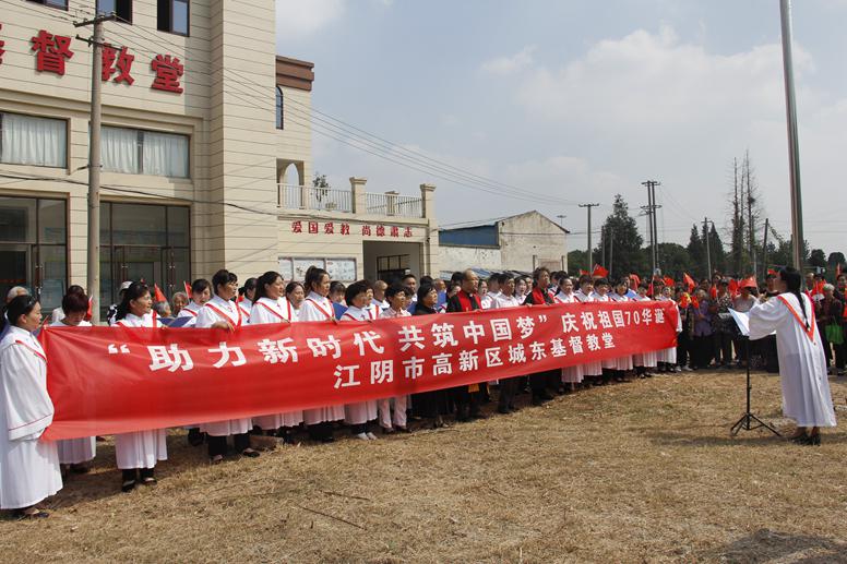 2019年9月29日下午,江阴市高新区城东基督教堂举行“助力新时代 共筑中国梦”庆祝祖国成立70华诞系列活动。城东教堂诗班成员和全体信徒200余人参加活动。江阴市反邪教协会领导莅临本次活动。