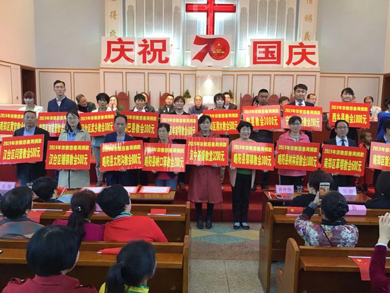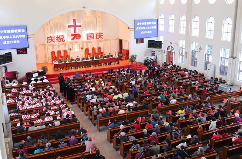 金秋九月阳光灿烂,汉水欢腾倾情歌唱 。在汉中橙黄橘红大地丰收的季节,汉中市基督教会于2019年9月24日,举行了“庆祝中华人民共和国成立70周年”系列活动。整个活动由三大部分组成,一是举行庆祝中华人民共和国成立七十周年座谈会;二是现场举行汉中市宗教慈善周捐款活动;三是举办欢庆祖国70华诞文艺演出。系列的三场活动紧密协调、环环相扣,一气呵成。市上有关部门领导,教会各堂点近200多人参加了这一盛大活动。