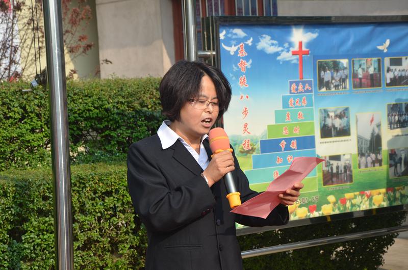 接下来,是宝鸡市基督教协会会长、岐山基督教两会主席王琼致词。她在致词中说:在这秋高气爽,喜庆祖国70华诞的美好日子里。由岐山县基督教两会承办宗教界、庆祝中华人民共和国成立七十周年和文艺汇演活动,是县政府和宗教界对我们的信任及重托。其意义在于歌颂祖国70年辉煌成就,宣传宗教中国化方向,激发广大信众爱国爱教的热情,自觉践行社会主义核心价值观,弘扬中华优秀传统文化,带头遵纪守法,自觉服务社会,用信教群众良好的言行作光作盐,荣神益人。