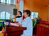 忽然,优美而舒缓的背景音乐渐渐鹊起。哦,那是陈海舫长老用钢琴弹奏出的“圣哉三一歌”美妙天音,犹如铺就了一条通往主台的鲜花之路。只见唱诗班的姊妹弟兄,在旋律中徐徐登上主台,在十字架前依次依阶站好队型。然后,他们在钢琴音乐的继续伴奏下,怀着对主的敬爱、声情并茂的献唱了《敬老尊长歌》、《劳碌已尽歌》两首赞美诗歌。接着是慕映霞传道和梁红玲传道,登台分别宣读了圣经:耶利米哀歌1:1-6和提摩太后书 1:1-14章节经文。