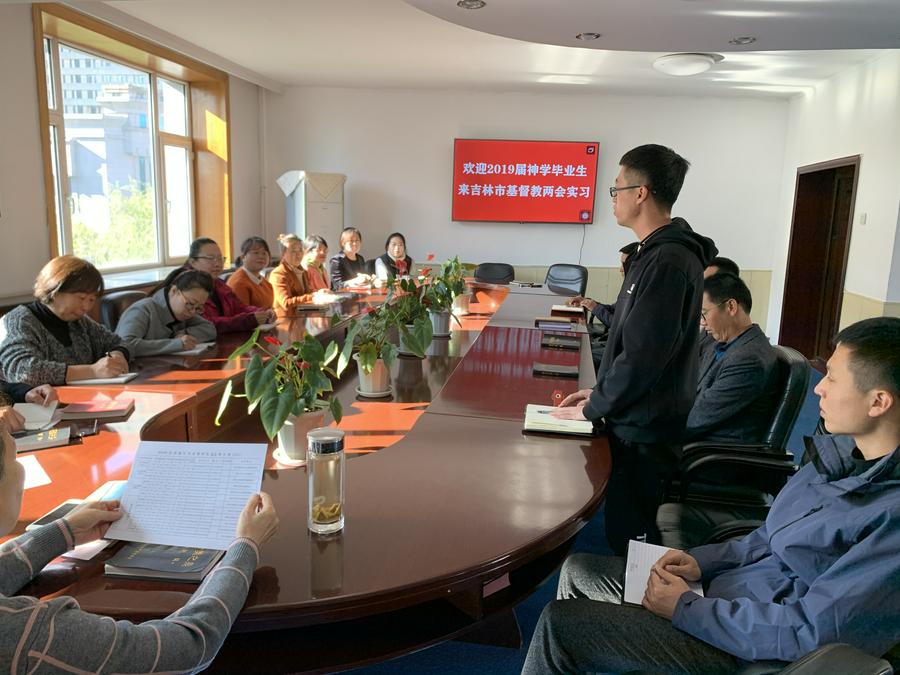 吉林市北京路感恩堂的教牧同工欢迎实习神学生的到来,吉林市基督教两会主席任大中牧师对实习生进行劝勉,她指出,安排神学毕业生实习,就是为了使神学毕业生能够将所学到的神学理论与新时代相同步,与教会实际相结合,高举中国基督教“三自”原则,坚持基督教中国化方向,在教会牧养、事工管理、讲道能力、人际沟通等各方面得到锻炼。使毕业生早日成为合格的教会牧者,成为合乎要求的新时代“工人”。通过实习,不仅开拓视野,丰富事奉经验,也加强了神学毕业生与基督教两会的联系,为事奉和发展打下良好的基础。