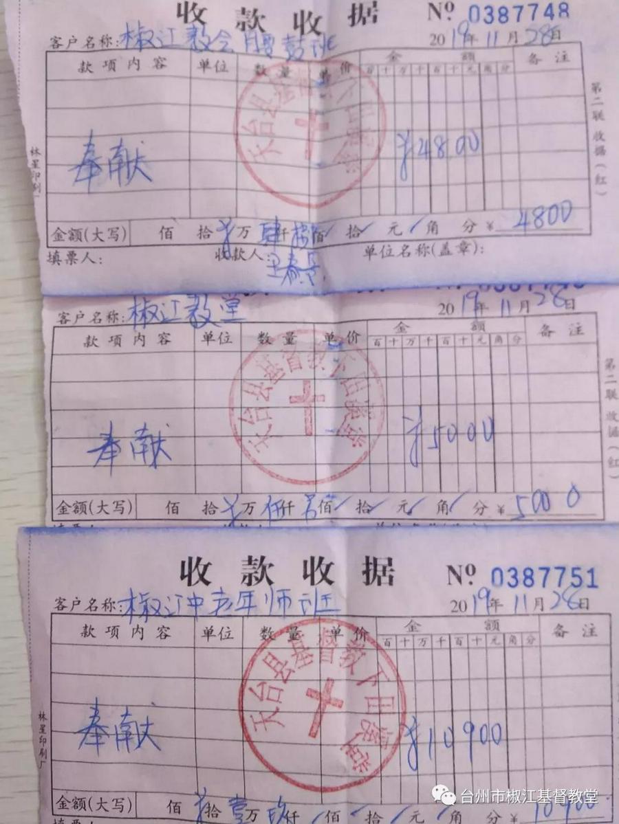 2019年11月28日是感恩节。承蒙上帝的预备,各级领导的关心和支持,主内同工同道竭诚奉献,现有教堂占地1500平方米(教堂占地500米),可容纳800人的礼拜堂得建成。为荣耀主的名,感恩神的带领和奇妙的帮助,天台县三合镇下田溪基督教堂举行三天的感恩聚会,特邀请椒江区椒江基督教堂同工同道参加感恩献礼。椒江堂组织了教会的中老年诗班、腰鼓班前往参加活动,并带上崇拜诗歌、腰鼓舞蹈和礼金:椒江教会爱心礼金5000元、中老年诗班爱心礼金10900元、腰鼓班爱心礼金4800元,并部分同工信徒的爱心礼金。