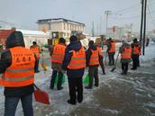 虽然大雪刚停,天气很寒冷,但大家齐心协力,中午也不休息,轮班吃饭,橘黄色的志愿者背心组成了乌兰塔拉大街上的一道亮丽的风景线。