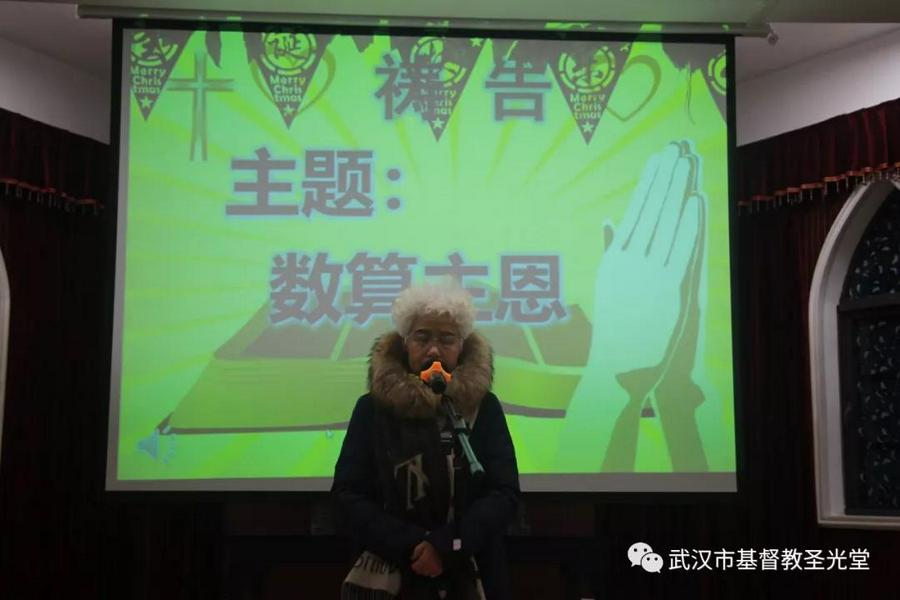 2019年12月31日晚上19:00 —2020年1月1日00:30圣光堂举行跨年祷告会,有150多位弟兄姐妹参加。冯念教师、缪永菊姊妹、狄刚弟兄、熊文博弟兄、张苗姊妹们弹琴赞美,带领弟兄姊妹用心灵和诚实敬拜;杨茜传道以“数算神的恩典”为题分享。杨玲姊妹以“悔改”带领大家默想,每一位弟兄姊妹数算神的恩典并积极踊跃为主做美好见证。