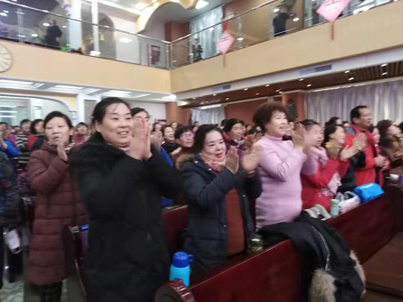 十里铺教会依次有序的先后演出了圣剧《耶稣降生》、快板《弟兄姊妹表表心》、双黄《浪子回家》、男女声小合唱《成为异像、把你的人生交给主掌管、仰望神的人》、手语舞《主祷文》、舞蹈《天堂的赞歌》、《草原儿女为主歌唱》、《让爱开出最美的花》等10个节目。坐在一旁的易长老对笔者夸赞说,十里铺堂今年圣乐崇拜节目的确不错!还没等把话说完,就被瞬间响起的掌声打断,笔者也使劲鼓起了掌。节目演完,到了吃中午饭的时候。
