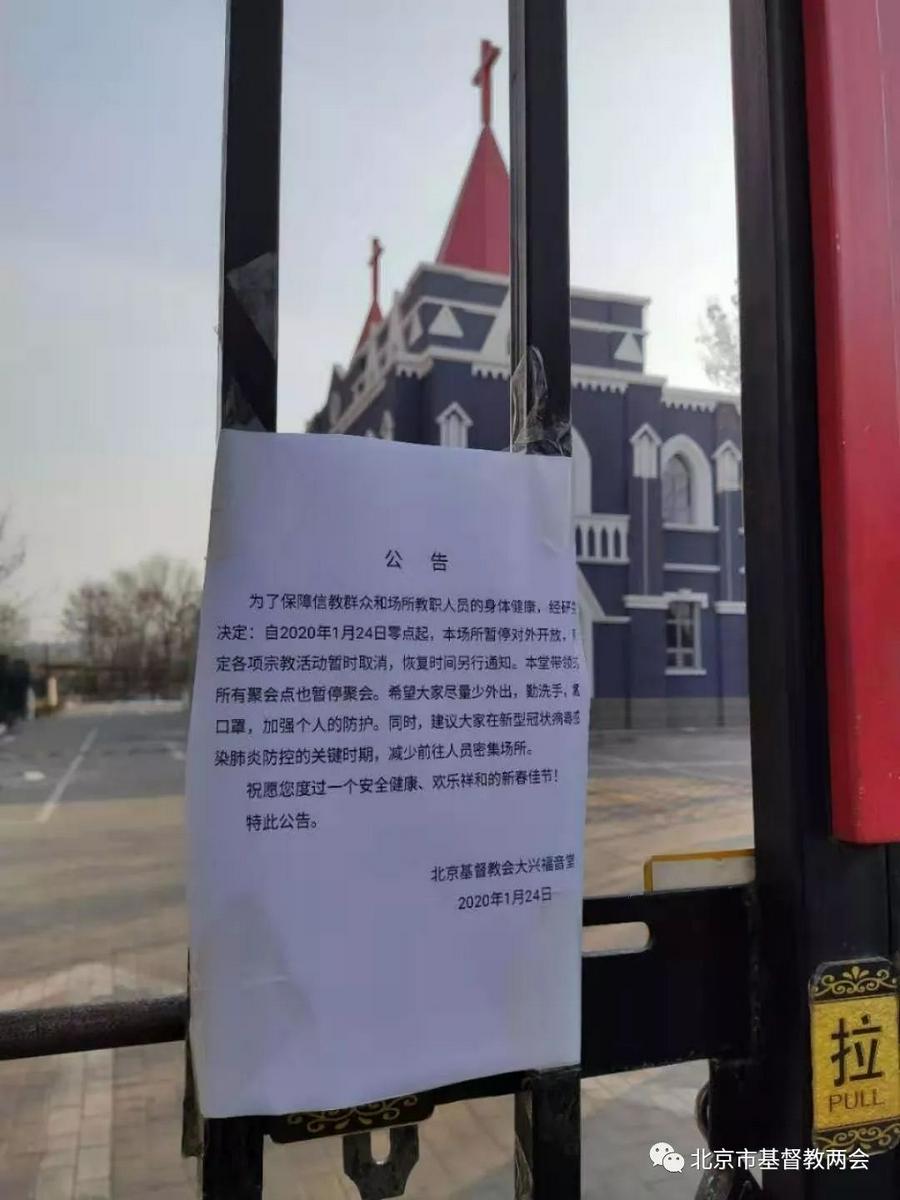 1月23日上午,北京市基督教两会召集各堂点、燕京神学院、爱德敬老院、青年会、女青年会负责人及两会秘书处工作人员召开专项工作会议,蔡葵主席主持会议,市民族宗教委宗教二处领导出席会议,部署新型冠状病毒感染的肺炎疫情防控工作;1月23日晚,王欢秘书长参加市民族宗教委专项工作会议,根据全市统一部署,市两会于1月24日凌晨向各堂点发出了《关于全市基督教活动场所暂停对外开放及停止集体宗教活动的通知》,要求各堂点及所其联系的聚会点自2020年1月24日零点起暂停对外开放及停止开展各类集体宗教活动,得到了各堂点的积极响应。各堂点根据工作部署,成立了本堂点疫情防控工作领导小组,制定了应急预案,密切保持与市两会及所属地区相关部门的联系,加强场所消毒和通风工作,通过张贴公告、在微信公众号、微信群发送通知等方式及时告知广大信徒,并安排教职人员到堂点做好对部分未接到通知的信徒的解释劝阻工作,得到了广大信徒的理解和支持。