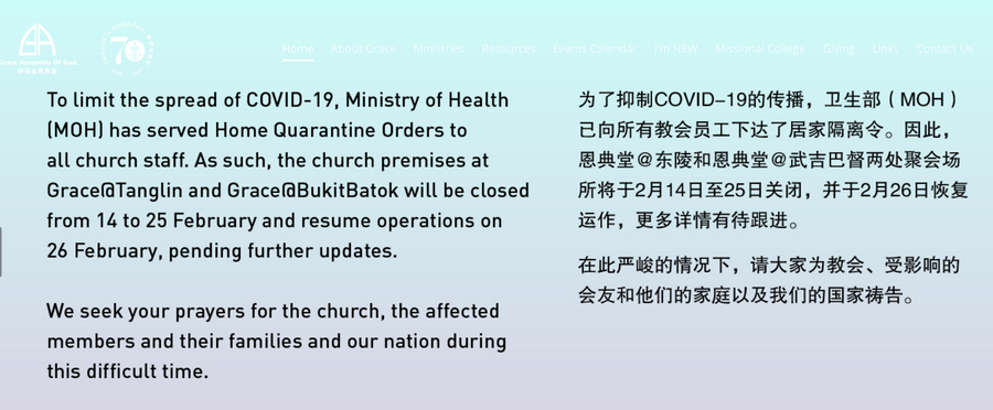 近日,有消息曝出,新加坡神召会恩典堂(Grace Assembly of God-Singapore)主任牧师赵克文确诊感染新冠肺炎。截至2月16日,神召会恩典堂已致共18人确诊,成为新加坡本地最大的感染群。
