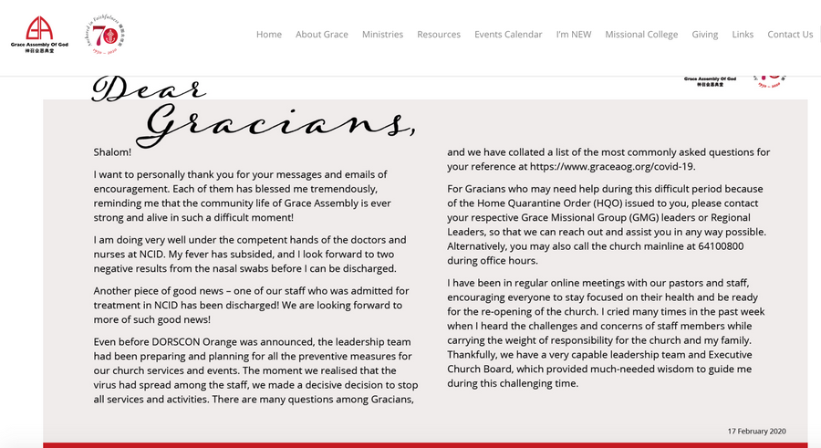 对此,赵克文牧师在恩典堂官网公开信中表示,他自2月11日起在国家传染病中心接受治疗,目前恢复状况良好,“很抱歉,这个消息给您增加了一份担忧。”他也表示在基督里有信心得胜,并勉励信徒说:“随着疫情的发展,我们也必须做好准备,情况在好转之前可能会变得更糟糕。黎明前总是最黑暗的——作为一个教会,这正是我们聚集在一起,仰望那位我们信心创始成终的耶稣。”赵牧师感谢大家的鼓励和代祷,表示期待能完全康复,届时还会与大家分享教会战胜病毒的旅程,并呼吁信徒配合卫生局调查,如果感到不适要立即就医。