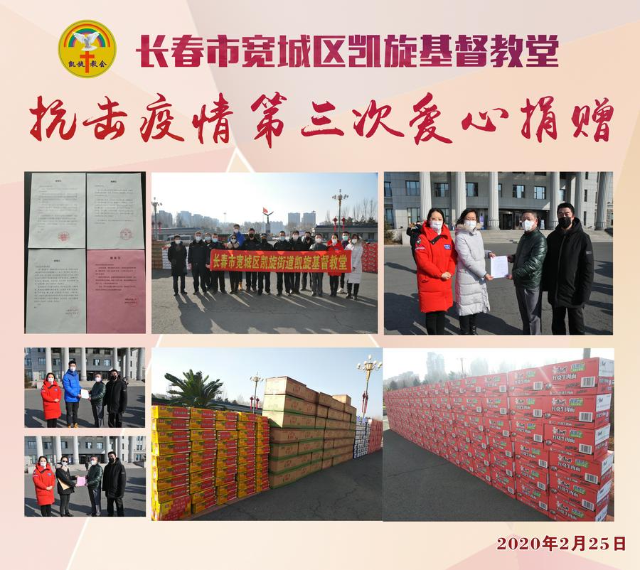 同日,长春市宽城区凯旋基督教堂向区政府捐助各类方便食品价值1.7万元,以解决疫情防控人员的生活需要。
