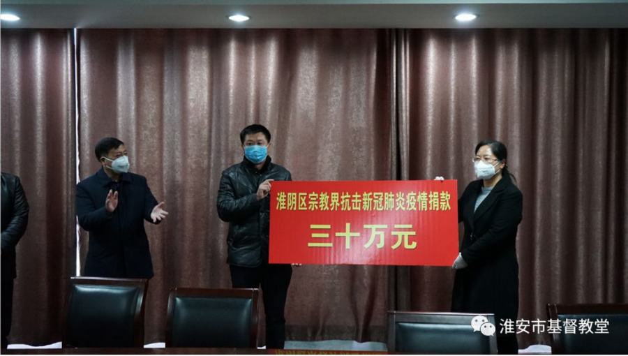 截止到2020年2月22日中午,淮安市各县区教会捐款捐物金额累计达到1,105,402元。其中,透过爱德基金会捐助疫区急需医护用品折合人民币308,850元,透过各县区红十字会和慈善总会捐助疫区744,052元。