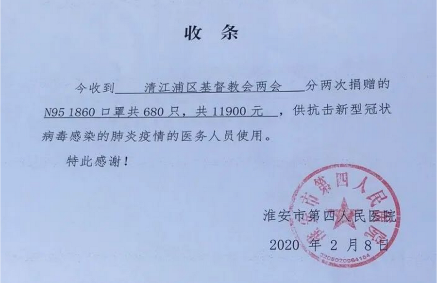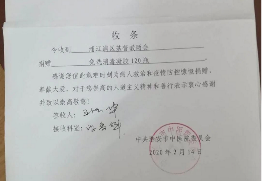 清江浦区基督教两会向淮安市第四人民医院捐赠医用口罩和防护服,向淮安市中医院捐赠100只医用护目镜和120瓶医用免洗消毒液。