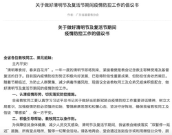 3月17日,广东省基督教两会于官网发布了《关于做好清明节及复活节期间疫情防控工作的倡议书》,呼吁全省教牧同工和众弟兄姐妹积极配合,在节期临近时不组织和参与任何形式的墓园省亲祈祷活动,不搞私下小聚会,改为居家唱诗、祷告追思等方式进行缅怀。