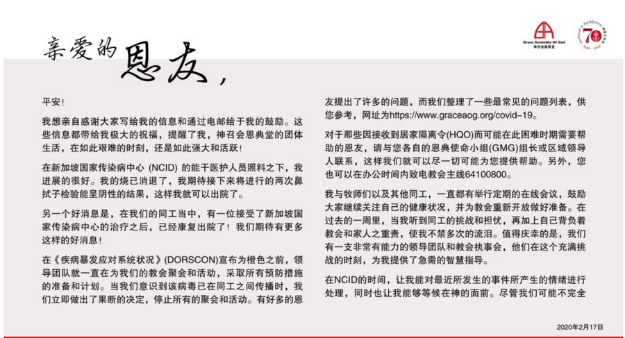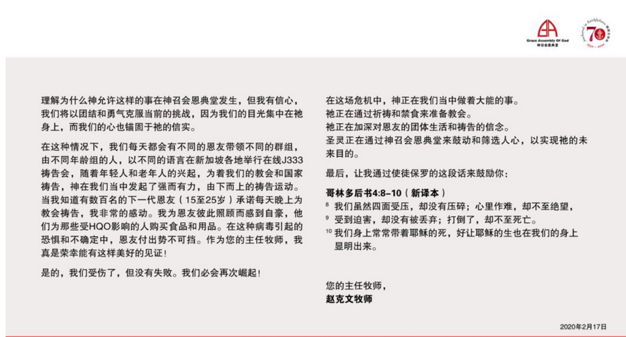 此前有媒体报道,2月16日,因恩典堂的聚集而感染新冠肺炎病毒的共有18人,成为新加坡本地最大的感染群,其中就有该堂的主任牧师赵克文,他写下公开信,表达对于信徒的歉意,并表示在基督里有信心得胜,勉励信徒们仰望为我们信心创始成终的耶稣。他还说,如果完全康复,会与大家分享教会战胜病毒的旅程。