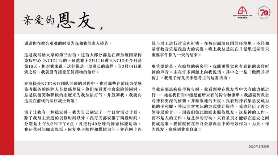 “我已正式成为2019冠状病毒的夸胜者,可以回家再次拥抱我的家人。”新加坡神召会恩典堂主任牧师赵克文自2月11日被确诊新冠肺炎后,经历了10天的隔离,他于20日给会众和信徒写了“第三封信,感谢大家的代祷,并见证了神如何带领他走出“流泪谷”。