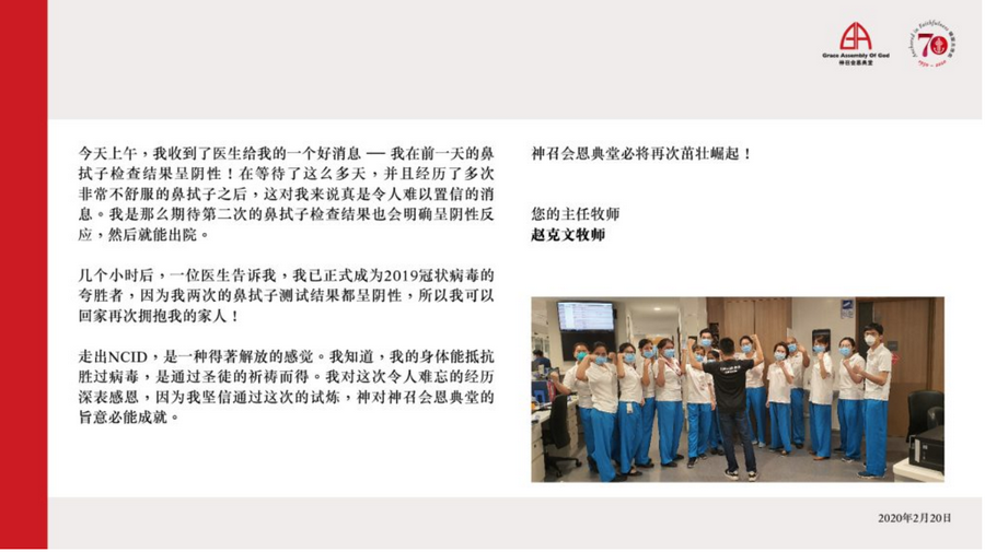 “我们被病毒所伤,但没有被击败,在基督里,恩典堂必再次在合一和祷告中兴起,并能去帮助那些受病毒感染的人。神的子民以羔羊的血和所见证的道,能战胜惧怕,因为基督已经得胜死亡。”