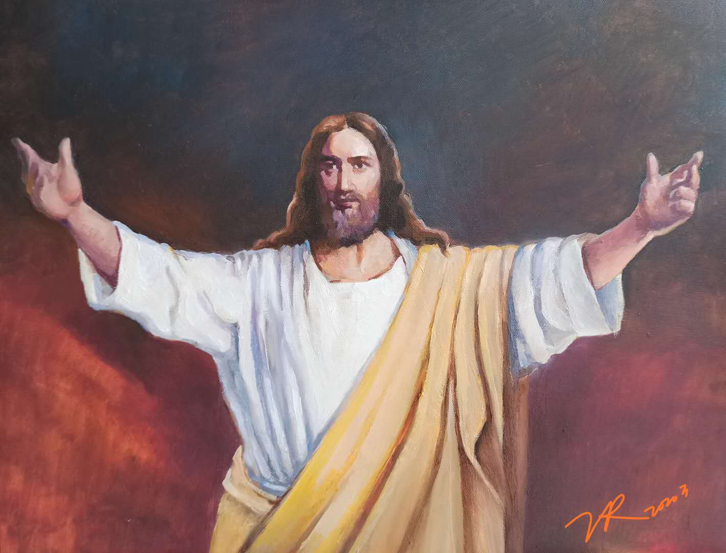 里佐仁弟兄有绘画和设计、美术等方面的恩赐,也是当地比较有名气的画家,作品多次在省市展出、获奖。暂停聚会期间,他除了正常的在网络参加聚会外,又利用自己的特长,拿起画笔,耗时一个礼拜的时间,带着对主耶稣基督的敬畏和真爱,用心创作了一幅宽50厘米宽、40厘米高的油画《复活的耶稣》,以此献给复活节。