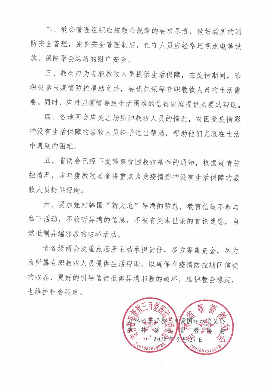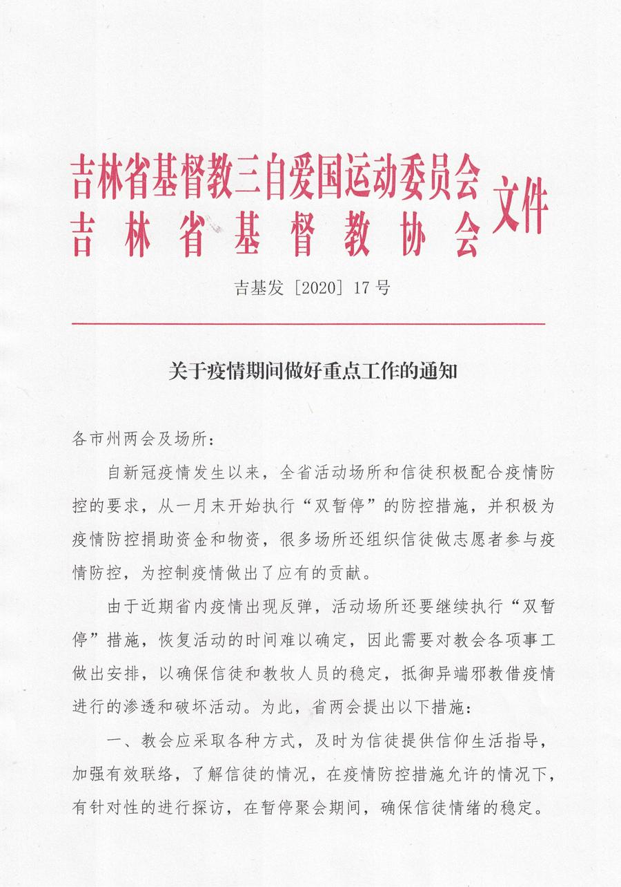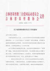 2020年5月27日,由于疫情防控导致吉林市封城,不能召开相关会议。为此,吉林省基督教两会下发在疫情期间做好重点工作的通知,要求全省各地两会和场所积极做好信徒牧养、教牧人员生活保障、贫困信徒帮扶、抵制异端邪教等重点工作。