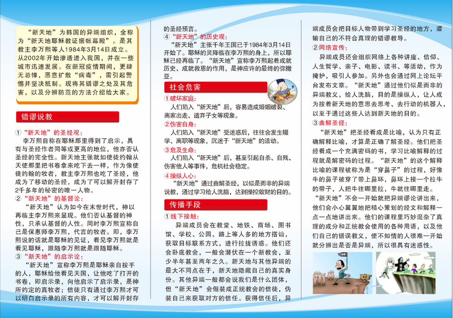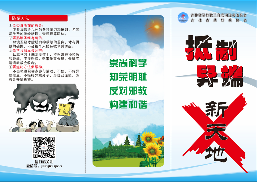 2020年5月27日,吉林省基督教两会为全省场所预备的抵制韩国“新天地”异端的海报和宣传折页印制完毕,并发往省内各市州两会,由各市州两会分发给基层教会。