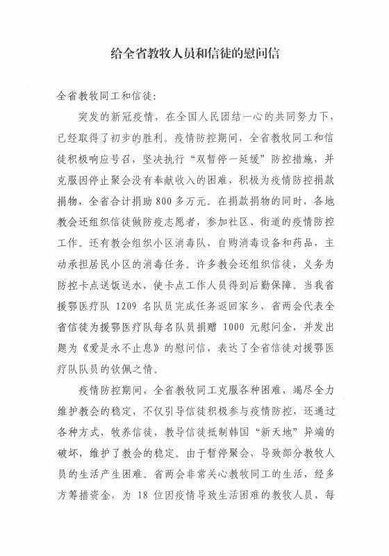 同时,向在疫情期间坚持牧养信徒,极力维护教会稳定,积极参与疫情奉献的教牧同工和和信徒,致以亲切的问候。
