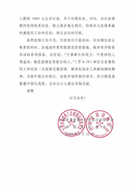 2020年6月22日,吉林省基督教两会为18位因疫情导致生活困难的基层教牧同工每人发放5000元生活补助,并向全省教牧同工和信徒发出一封慰问信。