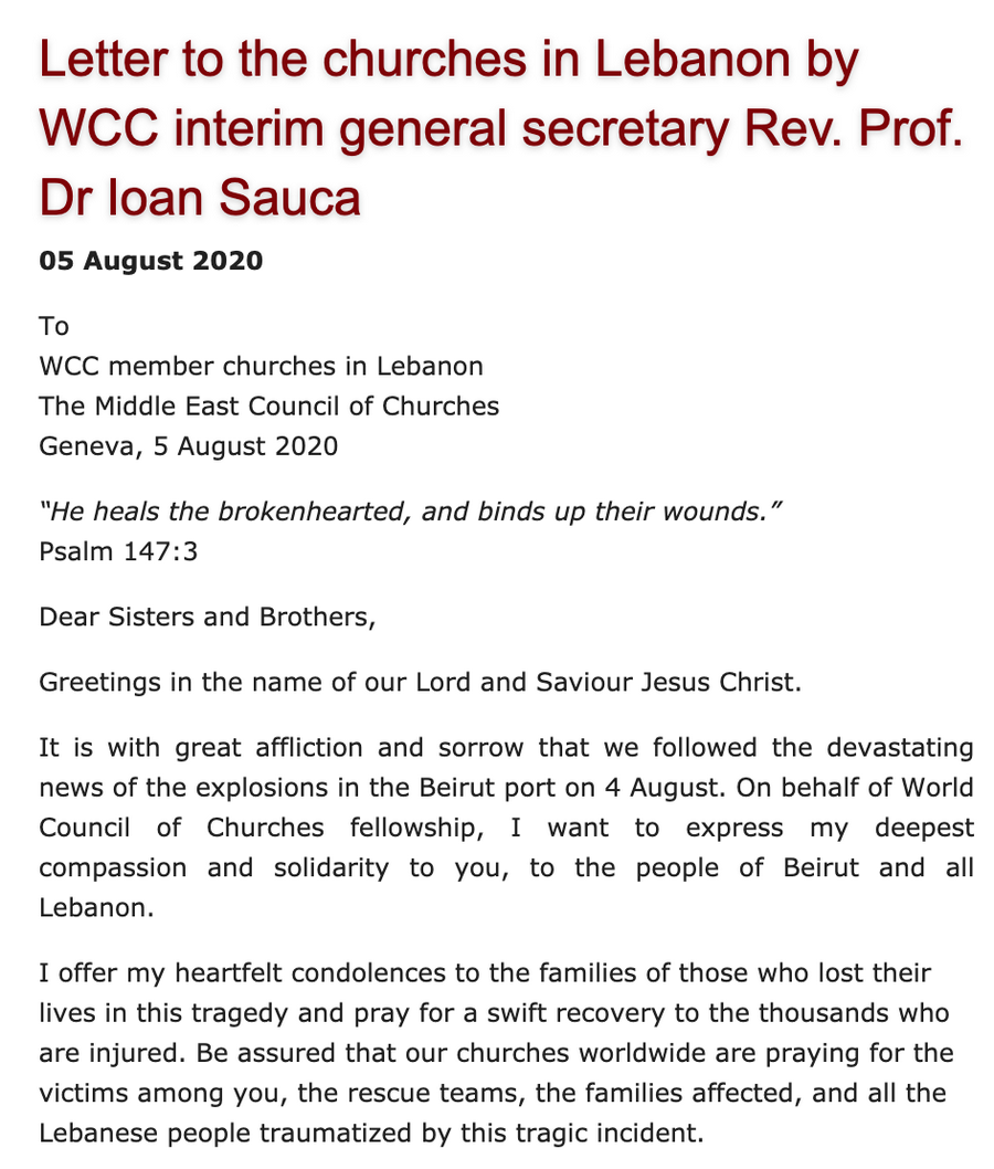 8月5日,WCC临时秘书长Loan Sauca博士在致黎巴嫩和中东成员教会的信中代表世基联团契表示深切的同情和声援。在慰问信的开头,他引用了诗篇147篇3节:“他医好伤心的人,裹好他们的伤处。”