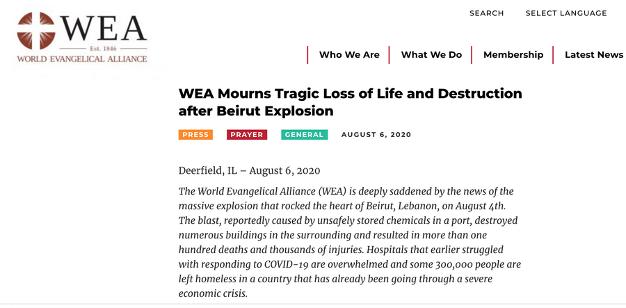 8月6日,WEA也发文表达了对贝鲁特爆炸后惨烈的生命损失和造成的破坏的深切哀悼。“8月4日,发生在黎巴嫩贝鲁特市中心的大规模爆炸消息使世界福音派联盟(WEA)感到非常难过。”