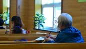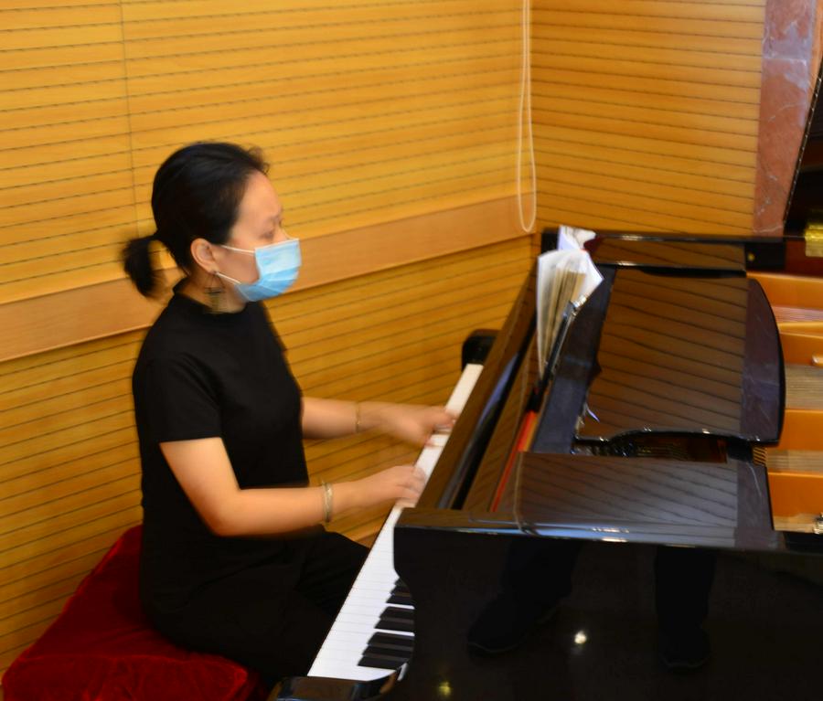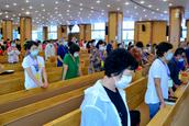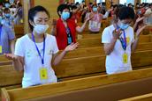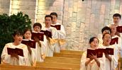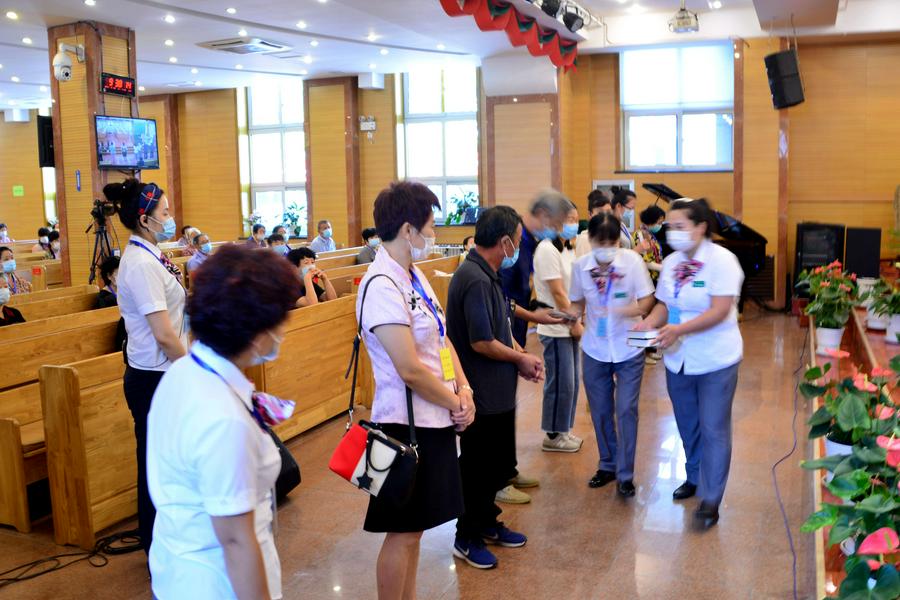 当我们来到教堂正门,早已有信徒依次排队在等候进入圣殿了。大家按照要求出示健康码、行程码、测温、登记,有秩序的在服务组的同工们指引下依次进入教堂,按照规定在座位上坐好。笔者注意到,虽然是座位有限,但是一楼主堂里面在八点之前就已经坐满了前来聚会的信徒,二楼两个副堂也是同样,楼上楼下可以说是座无虚席(允许的范围内)。