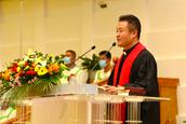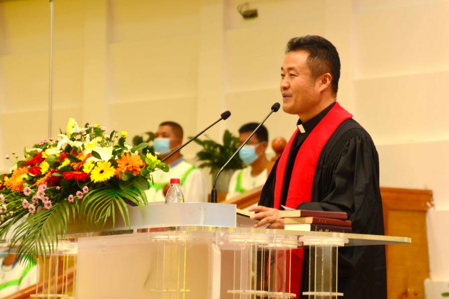今天为主证道的是丰收堂信徒熟知的大连百合堂的刘坤忠主任牧师。他带领会众诵读圣经希伯来书、马太福音的有关章节,宣讲了作为信徒不要留恋地上的钱财,不要被地上的各种私欲诱惑了。不要迷失在世界上,看不到神。同时,信徒也要带领家人,做好家庭属灵的领袖。