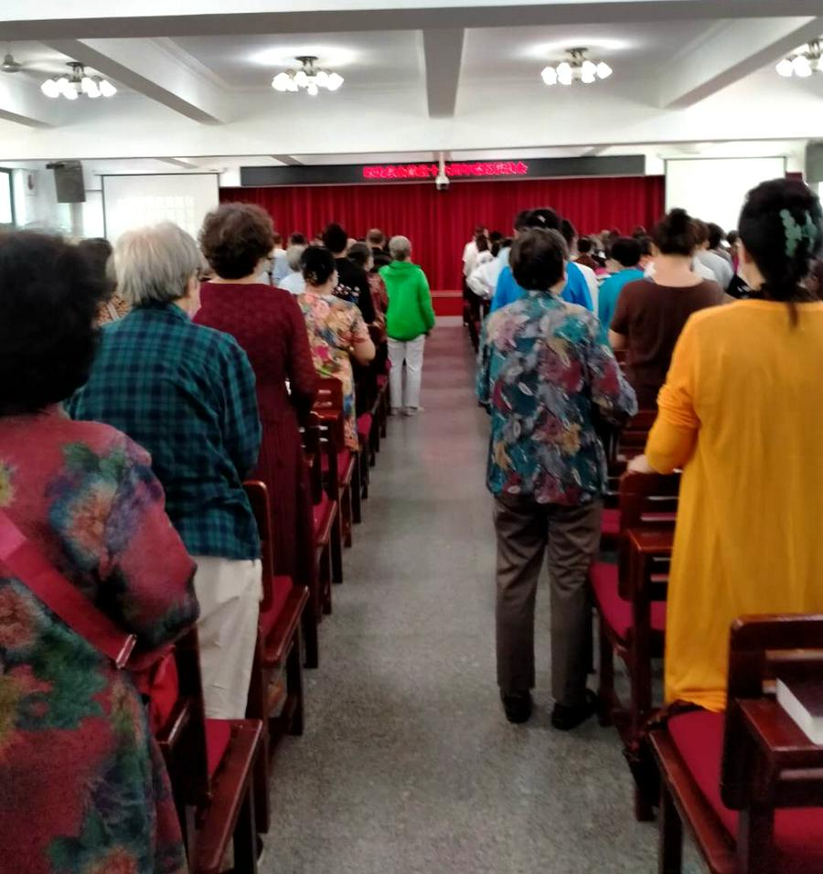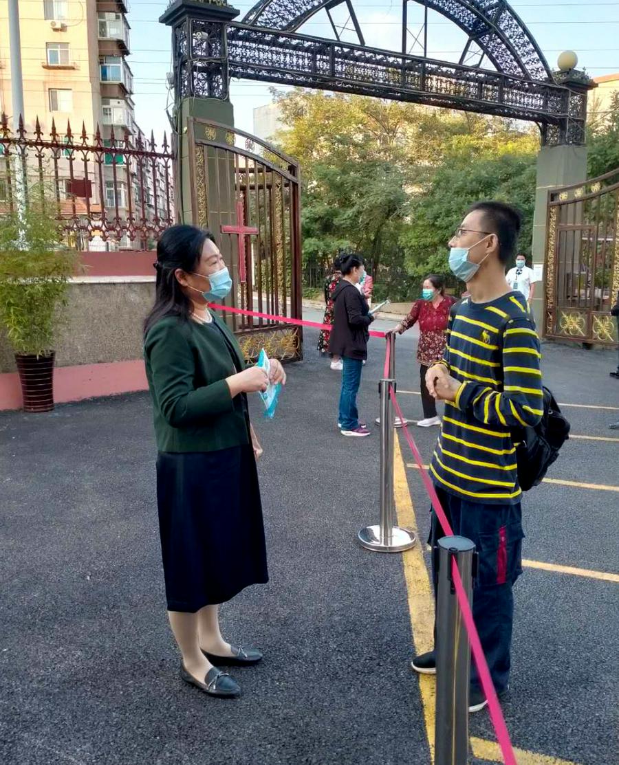 主日,阳光明媚、蓝天白云、秋高气爽。坐落在鞍山二一九公园劳动湖畔、东山风景区山麓的绿化堂充满节日的气氛。清晨,鞍山市基督教教会协会会长、本堂袁明牧师带领各位牧师、执事、班组的负责人和各班组服侍的弟兄姊妹在教堂正门喜乐的迎接前来参加主日证道、赞美会的会众。聚会的信徒们有序的、安静的依次排队,经过登记、验码、测温等规定程序进入到主堂和副堂。