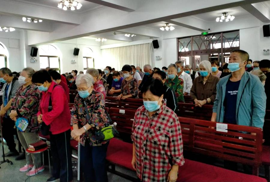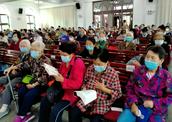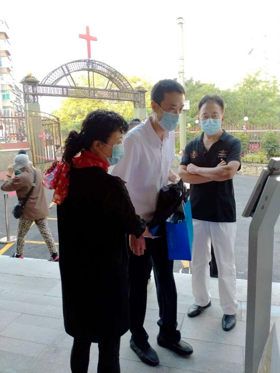 今天,带着对主感恩的火热、虔诚心情,信徒们从四面八方来到教堂。聚会的人们从教堂的一楼到四楼座无虚席、济济一堂。由于人多,只好按照间距在教堂的小广场上摆好凳子,安排信徒参加聚会。