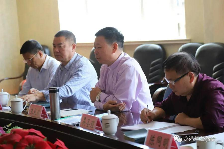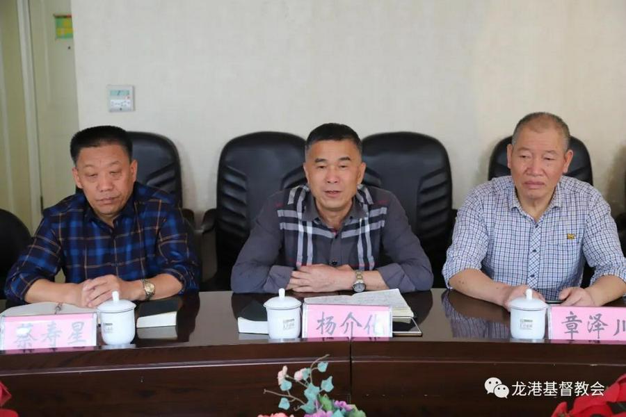座谈会上,龙港市基督教两会主席杨介化长老代表市两会对客人来访表示热烈的欢迎并就龙港市基督教基本情况和新成立的龙港市基督教两会暨第一次代表会议顺利召开和市基督教两会下步工作开展及圣职按立、教牧培训、教堂产权登记等作了汇报发言。