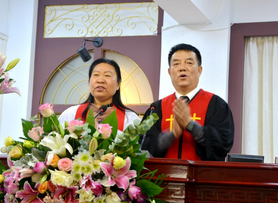 史爱军长老证道结束后,与鞍山市基督教协会会长袁明牧师共同在圣台前歌诗赞美、感谢上帝,并带领信徒一起高唱《我今天为你祝福》,从而拉开了绿化街教会2020年秋成感恩赞美会的帷幕。