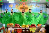 感恩节的好日子,大孤山教堂小舞台前,摆满了象征五谷丰登、充满主恩典的各种水果、蔬菜、粮油等,充满丰收的景象和节日的喜庆;参加演出的弟兄姊妹们所精心预备的十五个节目,是他们排练了一个多月,有的班组每个礼拜就要反复排练四次的心祭呈现给神。在主恩典充满、圣灵充满的欢庆气氛中,弟兄姊妹将感激之情以掌声送给神,也为演出的同工们点赞。此时此刻,小舞台上主的恩典浩大无限,“光荣威严环绕着他;大能、喜乐充满他的殿宇。地上万民都要颂赞上主;要赞美他的荣耀和大能力。”(历代志上16:27-28,现代中文译本)会众欢腾、喜乐开怀、拍手赞美在这圣殿之中。