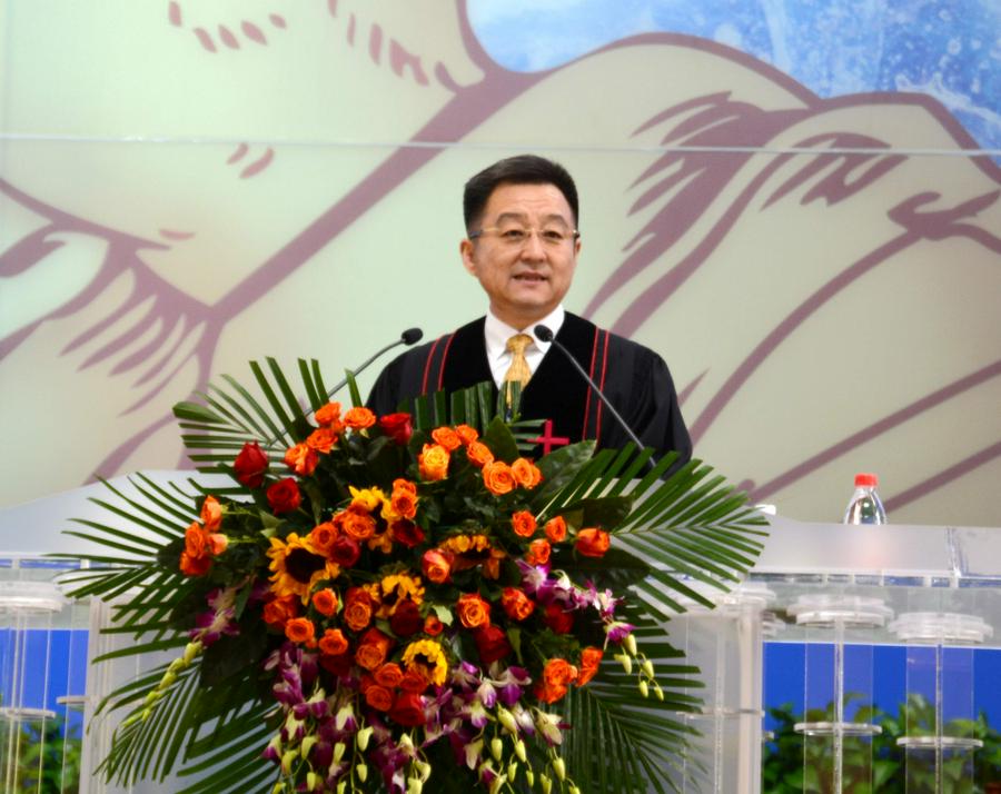 赵永刚牧师带领会众诵读大家非常熟悉的圣经新约哥林多后书13章14节经文:“愿主耶稣基督的恩惠、神的慈爱、圣灵的感动,常与你们众人同在”,并以耶稣基督的恩惠、圣灵的感动、常与我们众人同在三个方面与会众分享,为主证道。