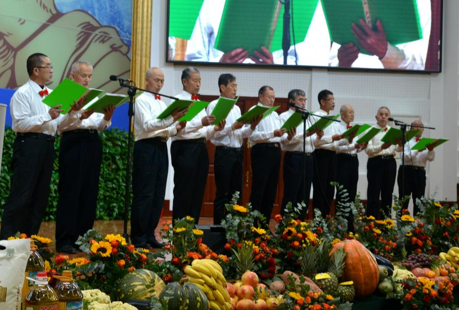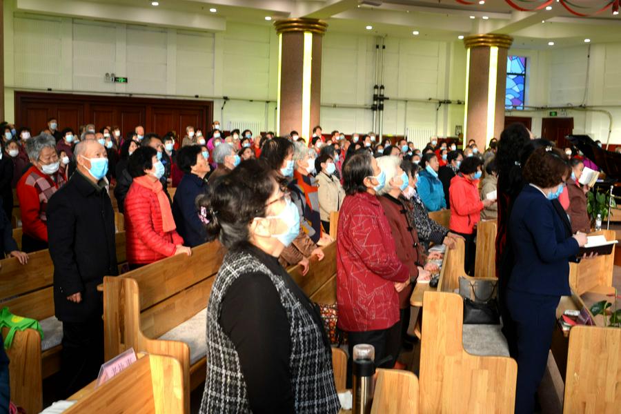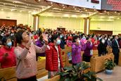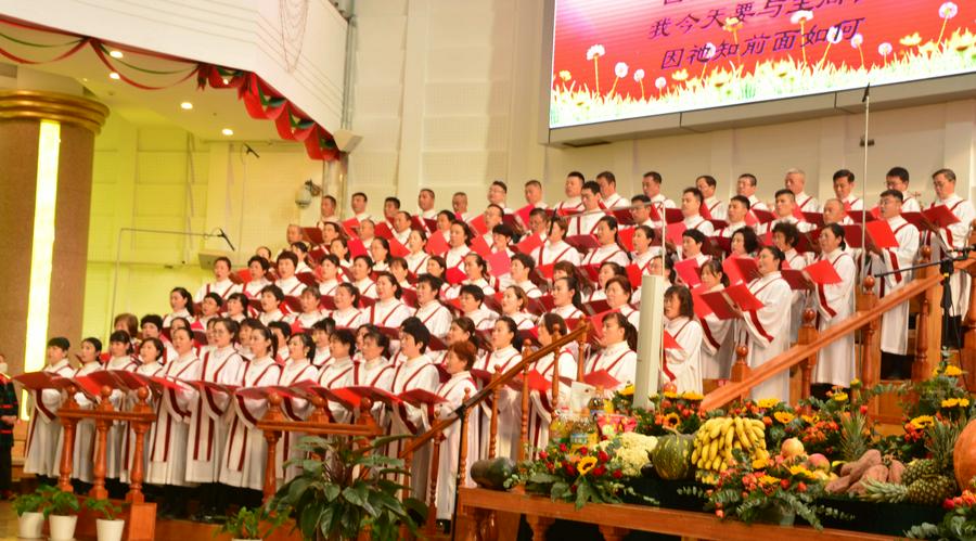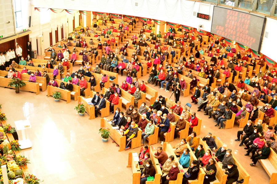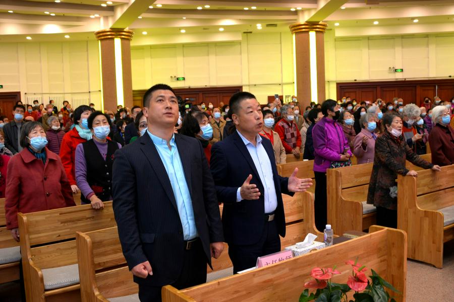 在庄严、温馨的圣乐中,大连市基督教三自爱国运动委员会主席、丰收堂赵永刚主任牧师身着圣服走上圣台问候弟兄姊妹感恩节快乐,聚会的信徒们互相问候身边的肢体节日快乐,并向对方热情表示:耶稣爱你,我也爱你!