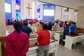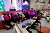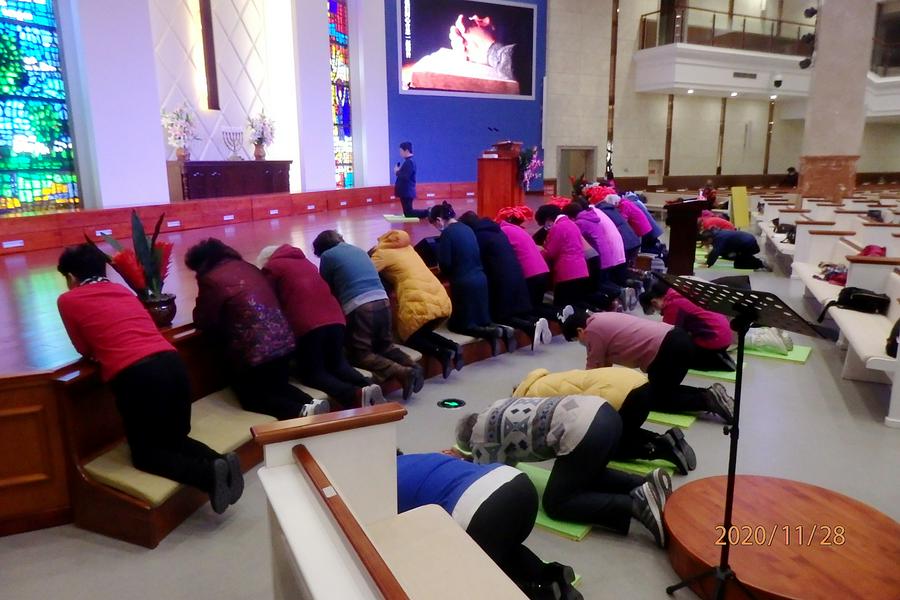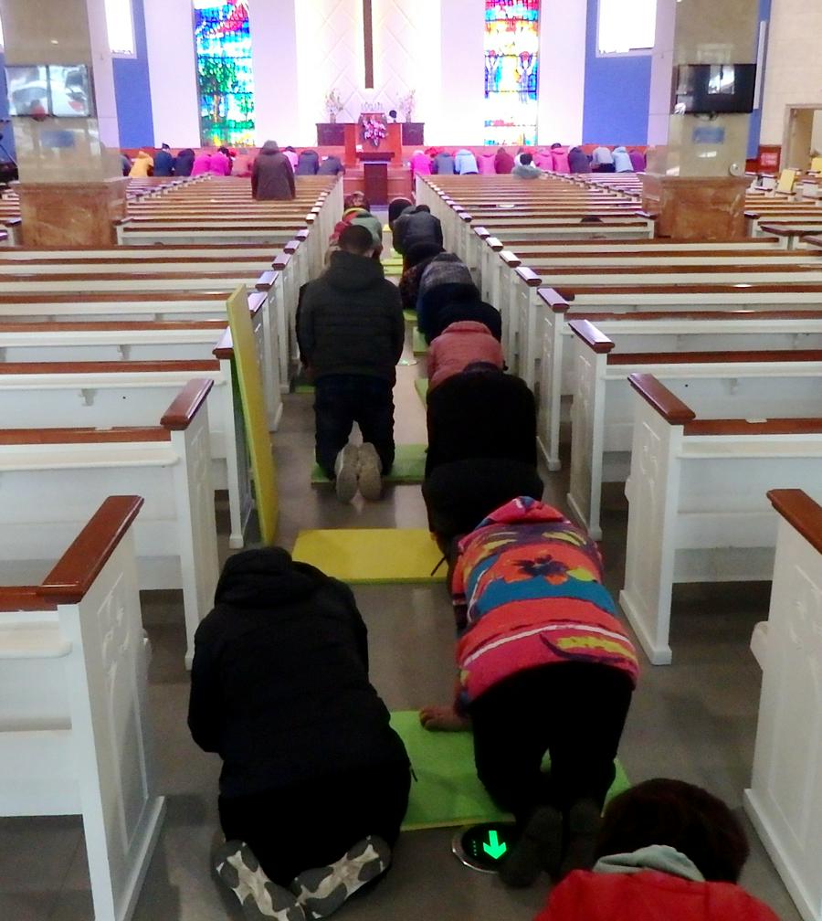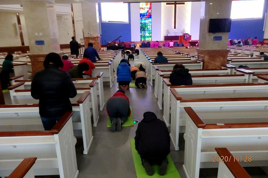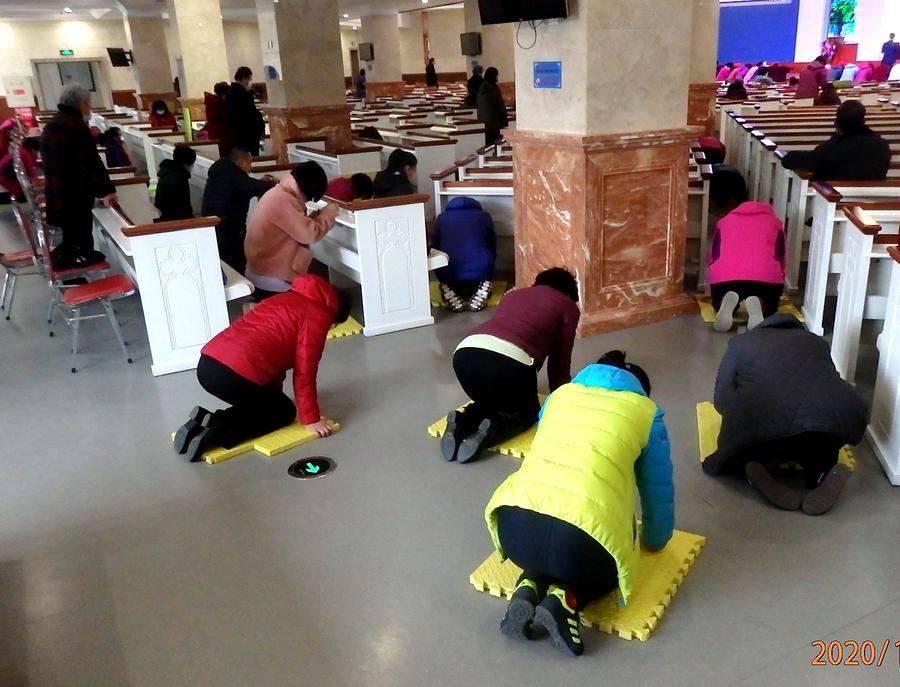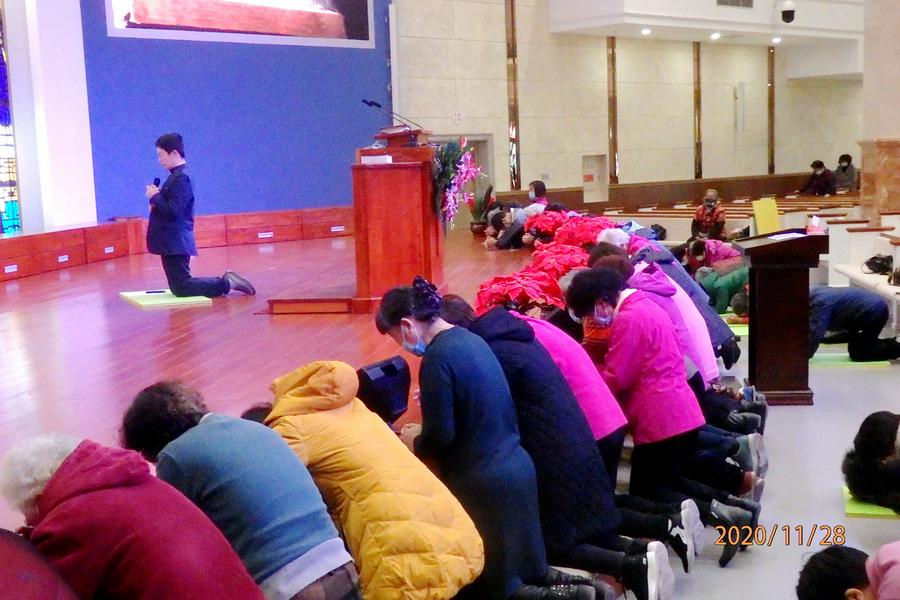 来到教堂的主堂祷告会正在举行,我被祷告会的现场所震撼和感动:只见吴兵主任牧师在圣台上跪在十字架前,带领参加祷告会的全体会众敬拜祷告。在圣台下面,一排排的信徒跪在地上,面对圣台正前方的十字架,跟随着吴兵牧师和同工的代祷,大家高呼同声“阿们”,他们为我们的国家祷告、为世界和平安宁祷告、为教会祷告、为传道人祷告、为会众祷告、为服事的同工祷告、为身体软弱和有病的肢体祷告、为即将开始的十二月份祷告、为圣诞节庆祝活动祷告……阵阵祈祷声响彻圣殿。如此的谦卑、如此的虔诚、如此庄严神圣的氛围、如此的大的集体跪拜祷告,这是笔者自信主以来极少见到的祷告场面,我不知道用什么词语来形容,还是那句话:震撼、感动!